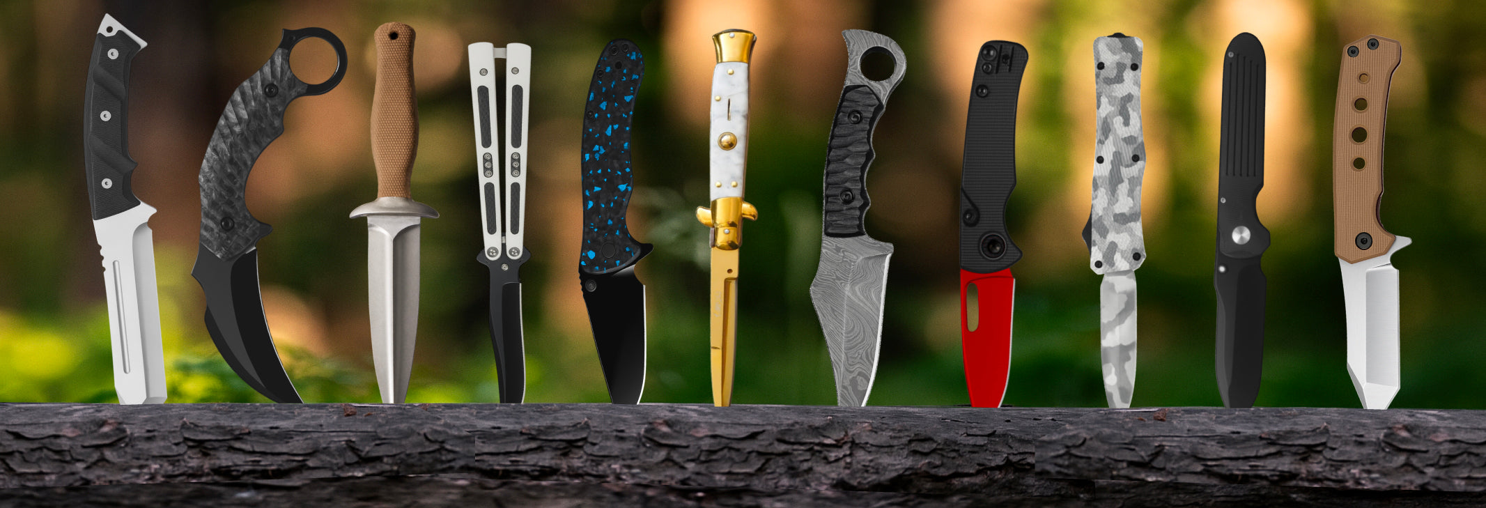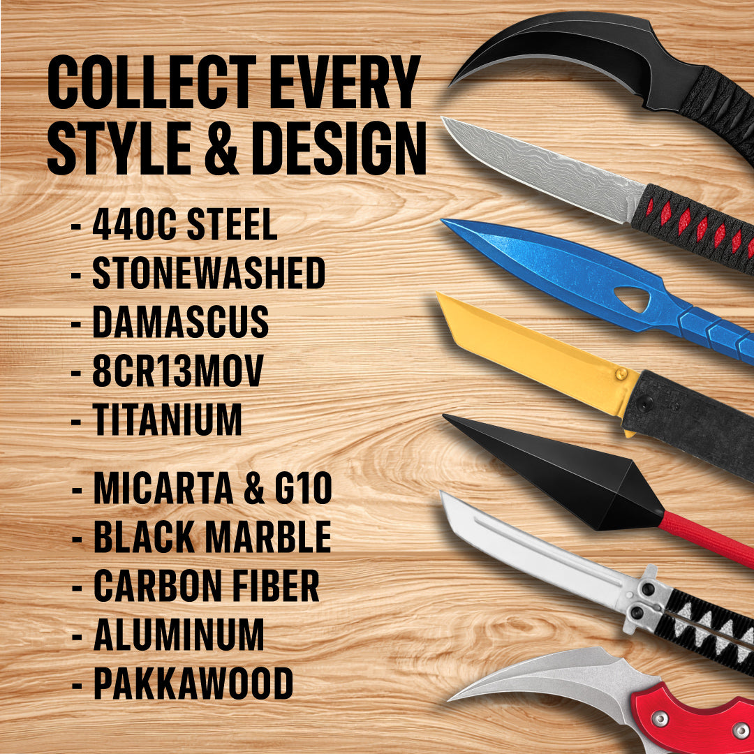 A collection of combat throwing knives, tactical karambits, and durable folding knives. All razor-sharp, durable, and premium-grade, with sheaths, rare knife stickers, and sometimes even bonus items! All knives are sharpened and hand-tested before shipping out.